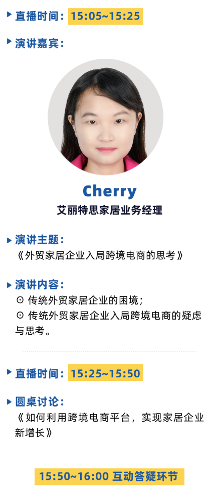 为广大外贸家具家居企业量身打造的“行业探索系列公开课-跨境电商专场”又将来袭。本次线上直播特邀中国国际家具展览会的战略合作伙伴,指定外贸B2B交易平台–大建云仓,以及e-Bay, 艾丽特思家居的5位行业打卡,带来他们各自的洞察和分享,为更多外贸家居企业解惑。
