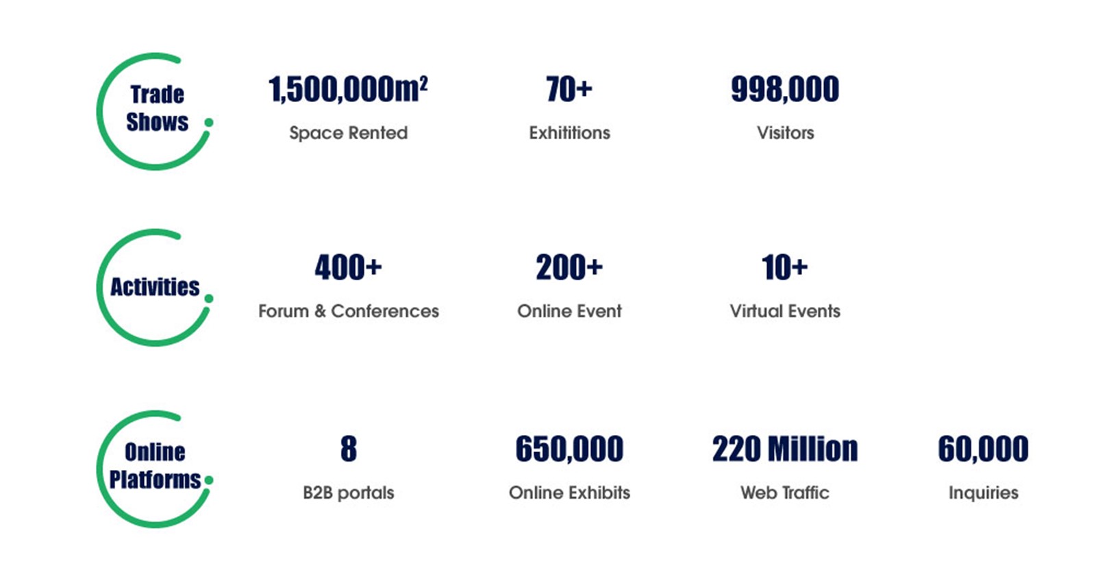The total exhibition rented area annually by IM Sinoexpo is over 1,500,000 sq.m, (accounted for 1/10 of Shanghai’s total exhibition rented area in 2019), creating multiple trade opportunities for nearly 1 million buyers worldwide. Developed since 2016, our online business now includes 8 major B2B platforms, 5 B2P sourcing mini-programs and 1 application. The total number of employees is near 500.